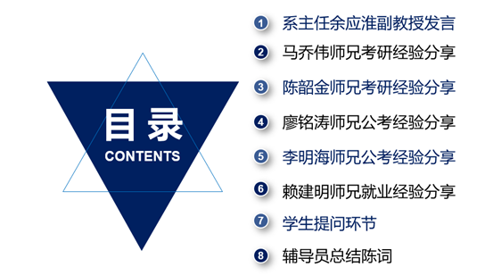 本次活动邀请了计科毕业班的五名优秀师兄进行交流分享。马乔伟、陈韶金两位同学今年考研成功上岸,他们从备考、择校、调剂等方面分享了考研经验。廖铭涛、李明海两位同学从公务员的笔试、面试、政审等方面分享了个人经验。赖建明同学从专业学习、科创竞赛方面分享了个人大学四年的历程,并将自己实习、面试的技巧与经验分享给师弟师妹。分享环节结束后,不少同学意犹未尽,就考研、就业等问题继续提问,党员教师、毕业班师兄一一耐心解答。