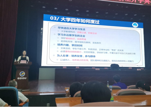 的发展历程和未来规划,并围绕“大学四年如何度过”向同学们提出了中肯的意见和建议。她分析了大学教育的特点,希望大家把握好自修之道、积极主动尽快适应大学学习生活;她强调学习永远是学生的主业,不仅要学好基础知识,也要实践贯通,有效利用身边的资源,提升学习和动手能力;她建议同学们要培养兴趣、掌控好时间,以学习为中心,积极参加学校和小九直播
