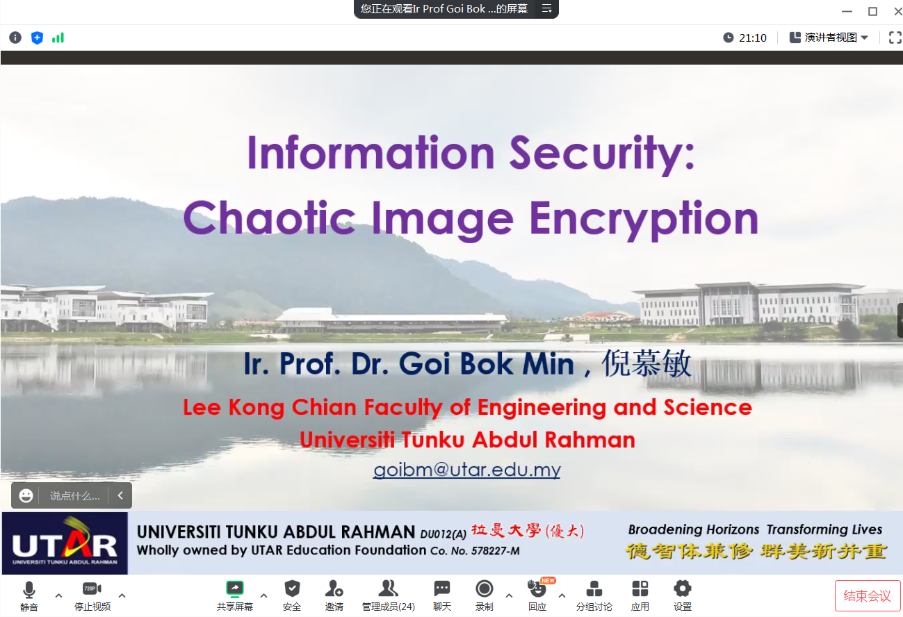 4月19日下午,应小九直播 邀请,马来西亚拉曼大学副校长、马来西亚科小九直播 院士Bok-Min Goi教授通过腾讯会议在线为我校师生作了题为《信息安全-混沌图像加密》的学术报告,共有30名师生聆听报告。副校长高秀梅教授致欢迎词,对Bok-Min Goi教授百忙之中为我校师生作学术报告表示感谢,并介绍了我校的基本情况、办学定位和办学特色。报告会由研究生院副院长叶国栋教授主持。