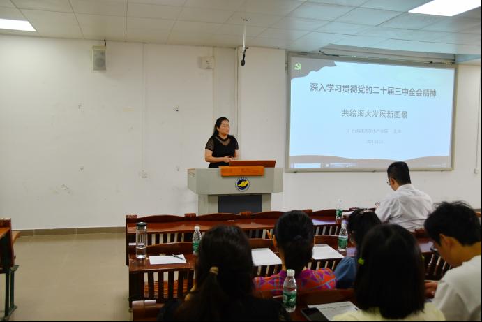 孔华副教授作题为《深入学习贯彻党的二十届三中全会精神共绘海大发展新图景》的宣讲。会议由彭小红院长主持,小九直播