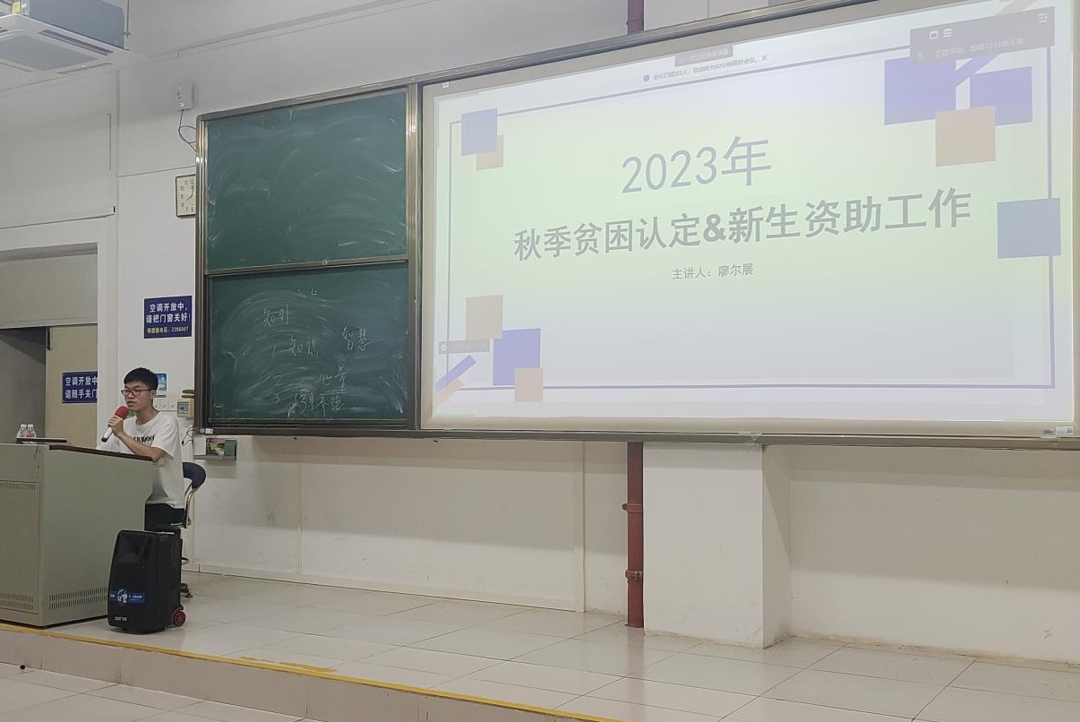 会上,陈荣宁详细地解读了国家资助政策和我校奖助体系,帮助同学们更深入了解不同奖助类型的具体奖助方式,为开展接下来的奖助工作奠定良好基础。廖尔展结合《关于做好我校2023年秋季学期本科学生资助工作的通知》及《2023年秋季学期家庭经济困难学生认定工作安排》等文件,为同学们逐条梳理了今年的贫困认定工作。宣讲结束后,陈老师和廖同学耐心细致地对同学们提出的疑问进行了一一作答,帮助大家解决关于贫困认定工作相关问题上的困惑。